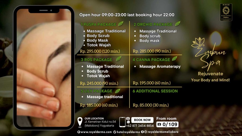 Don’t Hesitate to Visit Us, So why not visit Royal Darmo Malioboro Hotel Spa and experience the benefits of our spa treatments for yourself? We hope that your trip with your family will be a memorable one with our best services. Thank you.